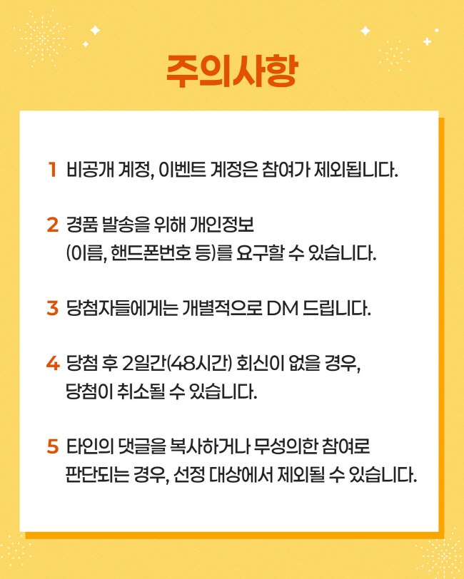 ️ 주의사항 - 비공개 계정 및 이벤트 계정은 참여에서 제외됩니다. - 경품 발송을 위해 개인정보(이름, 핸드폰번호 등)를 요청할 수 있습니다. - 당첨자에게는 개별 DM을 보내드립니다. - 당첨 후 2일(48시간) 내 회신이 없을 경우, 당첨이 취소될 수 있습니다. - 타인의 댓글을 복사하거나 무성의한 참여로 판단되는 경우, 선정 대상에서 제외될 수 있습니다.