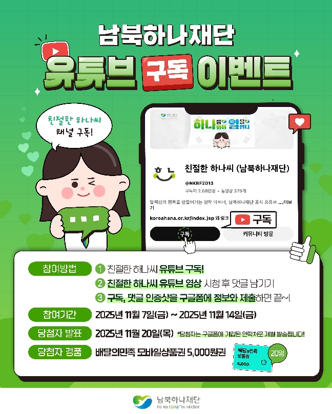 ️남북하나재단 유튜브 채널 구독 이벤트 ️(~11/14)