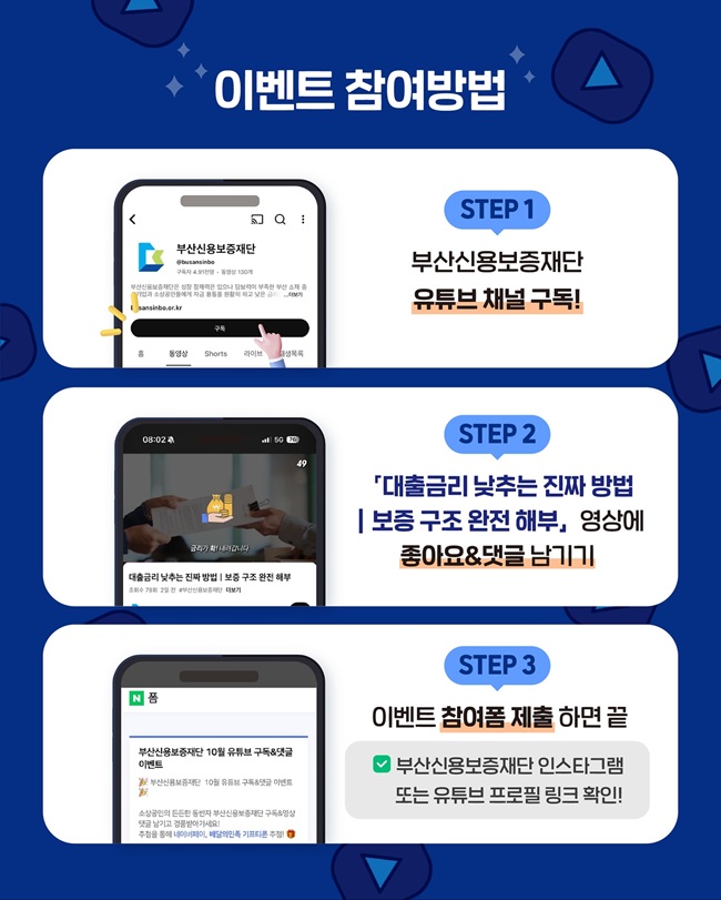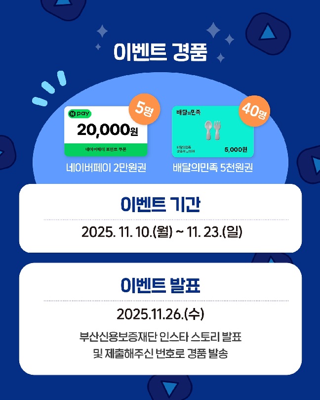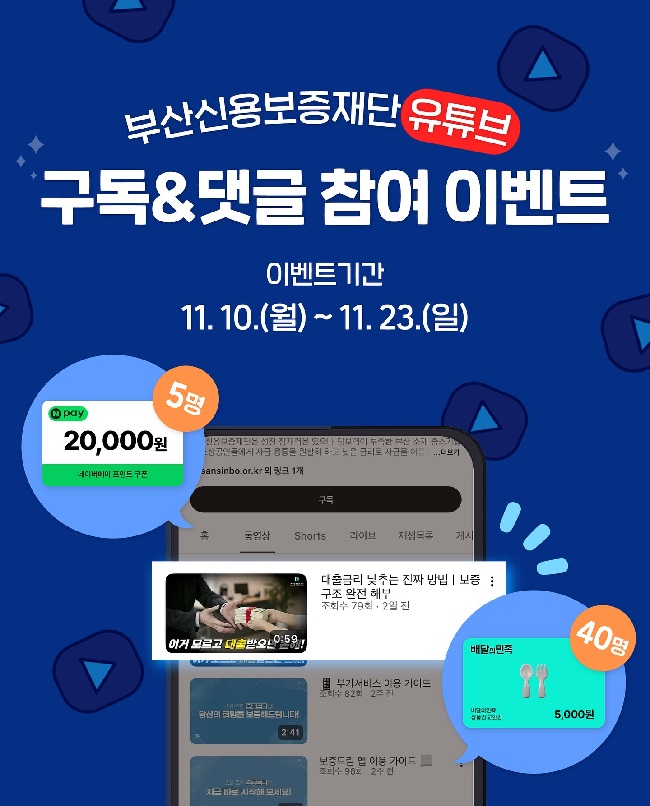 ![]() ![]() ![]() 부산신용보증재단 11월 유튜브 구독&댓글 이벤트 소상공인의 든든한 동반자 부산신용보증재단 구독&영상 댓글 남기고 경품받아가세요! 추첨 경품 #네이버페이 2만원권 #배달의민족 5천원권 이벤트 참여 방법 ① 부산신용보증재단 유튜브채널 구독 ② 가장 최근 업로드 된 영상에 좋아요&댓글 남기기 (제목 : 대출금리 낮추는 진짜 방법|보증 구조 완전 해부) ③ 이벤트 참여폼 제출하면 끝! 참여폼 링크는 @bcgf_official 프로필 링크! 이벤트 기간 2025.11.10.(월)~11.23.(일) 이벤트 경품 네이버페이 2만원권 (5명) 배달의민족 5천원권 (40명) 이벤트 발표 부산신용보증재단 인스타 스토리 발표 제출해주신 번호로 경품 발송 예정 부산신용보증재단이 당신의 희망을 보증해드립니다