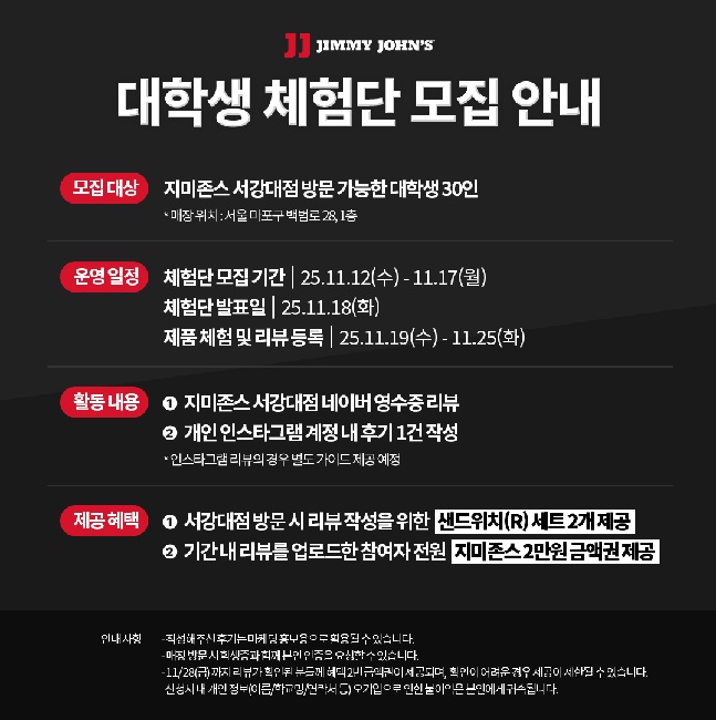 ![]() ![]() [지미존스 서강대점 오픈 기념] 미국 정통 오리지널 샌드위치 브랜드 지미존스 서강대점이 드디어 2025년 11월 18일 오픈합니다! 지미존스 서강대점 매장에 직접 방문해 미국 정통 아메리칸 샌드위치에 대한 리뷰를 남겨주실 대학생 체험단 30명을 모집합니다! ▶ 체험단 개요 - 활동 내용 : 지미존스 서강대점 제품 체험 후 리뷰 2건 작성 (네이버 영수증 리뷰 + 인스타그램 게시물 리뷰) * 인스타그램 리뷰의 경우 별도 후기 가이드 제공 예정 - 모집 인원 : 대학생 30명 - 매장 위치 : 서울 마포구 백범로 28 (신수동, 제 2서강빌딩 ) 1층 지미존스 서강대점 - 제공 혜택 1) 지미존스 서강대점 방문 시 리뷰 작성을 위한 샌드위치(R) 세트 2개 제공 2) 기간 내 리뷰를 업로드한 체험단 전원에게 2만원 금액권 추가 제공 - 모집 일정 : 11/12(화)~11/17(월) - 체험단 발표 : 11/18(화) - 매장 방문 및 리뷰 등록 기간 : 11/19(수) ~ 11/25(화) ▶ 대학생 체험단 안내 사항 1. 작성해주신 후기 콘텐츠(사진, 문구 등)는 마케팅 홍보용으로 활용될 수 있습니다. 2. 매장 방문 시 학생증과 함께 본인 인증을 요청할 수 있습니다. 3. 11/28(금)까지 리뷰가 확인된 분들께 혜택 2번 2만원 금액권이 제공되며, 확인이 어려운 경우 금액권 제공이 제한될 수 있습니다. 4. 신청서 내 개인정보(이름/학교명/연락처 등) 오기입으로 인한 불이익은 본인에게 귀속됩니다.