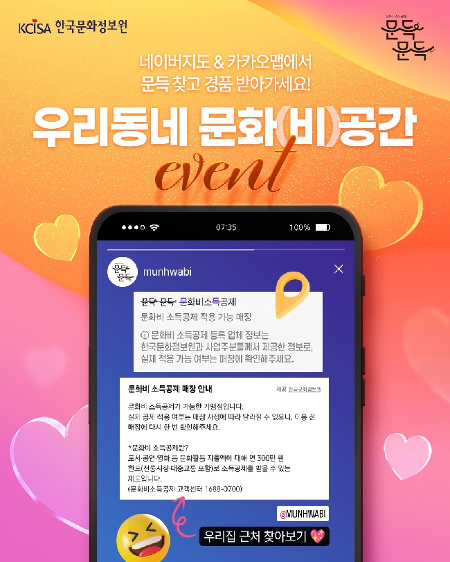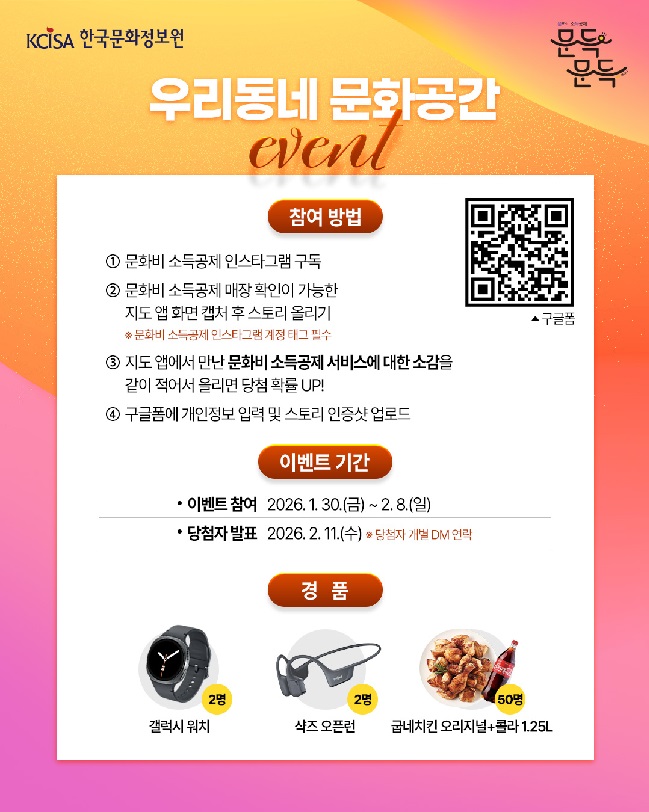 ![]() ![]() 우리동네 문화(비)공간 이벤트 네이버지도 & 카카오맵에서 문득 찾고 경품 받아가세요! 참여 방법 ① 문화비 소득공제 인스타그램 구독 ② 문화비 소득공제 매장 확인이 가능한 지도 앱 화면 캡쳐 후 스토리 올리기 * 문화비 소득공제 인스타그램 계정 태그 필수 ③ 지도 앱에서 만난 문화비 소득공제 서비스에 대한 소감을 같이 적어서 올리면 당첨 확률 UP! ④ 구글폼에 개인정보 입력 및 스토리 인증샷 업로드 이벤트 기간 - 이벤트 참여: 2026. 1. 30.(금) ~ 2. 8.(일) - 당첨자 발표: 2026. 2. 11.(수) *당첨자 개별 DM 연락 경품 - 갤럭시 워치 (2명) - 샥즈 오픈런 (2명) - 굽네치킨 오리지널+콜라 1.25L (50명) 구글폼 https://forms.gle/kcpbv92bAaMdqm1M6 여러분의 많은 관심과 참여 바랍니다!
