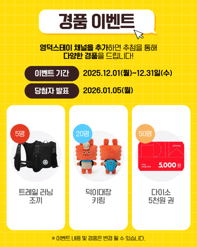 경품 안내 • 트레일 러닝 조끼 - 5명 • 덕이대장 키링 - 20명 • 다이소 5천원권 - 50명