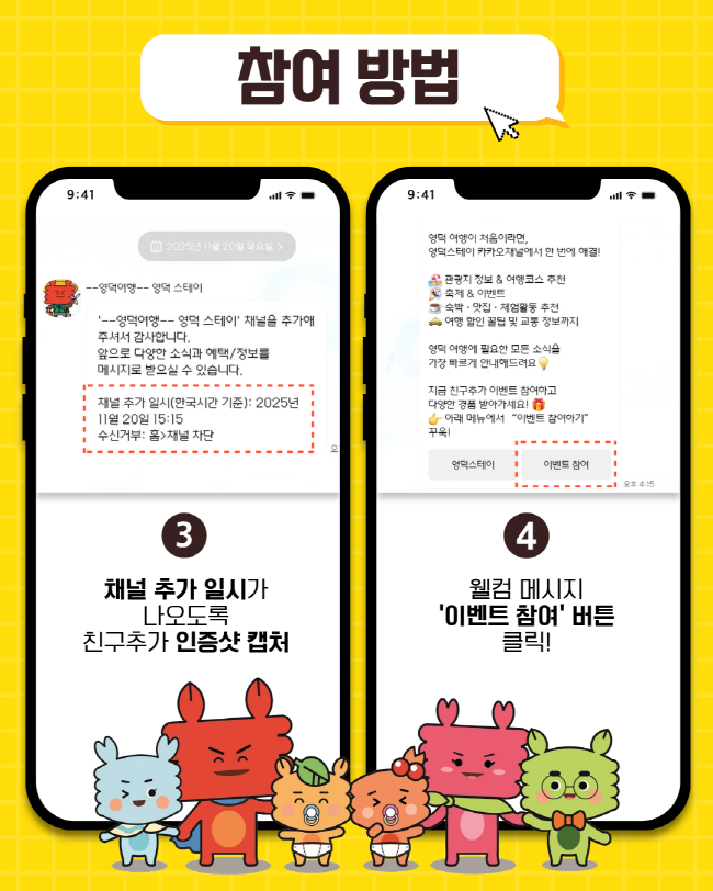 참여 방법 1. 카카오톡에서 "영덕스테이" 검색 또는 인스타 프로필링크 접속 2. 채널 친구추가 버튼 클릭 3. 친구추가 완료 화면 캡처 4. 웰컴메시지 내 "이벤트 참여" 버튼 클릭 → 정보 입력&캡처 사진 업로드하면 끝!