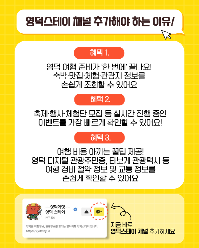 지금 바로 영덕스테이 채널 추가하고 여행 준비도 혜택도 함께 챙겨보세요!️