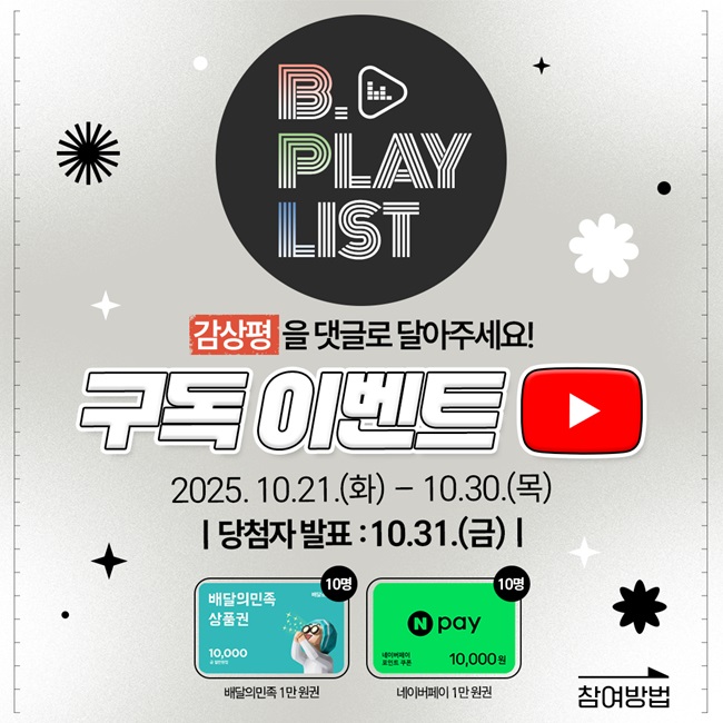 ![]() 부플리 대저생태공원편을 보고 '좋아요' 및 '감상평' 댓글을 남겨주세요! 참여해 주신 분들께 추첨을 통해 배달의 민족 1만 원권(10명)과 네이버페이 1만 원권(10명)을 드립니다. 참여방법 ① '부플리' 채널 구독 ② 해당 영상을 보고 '좋아요' 및 '감상평' 댓글 남기기 ③ 구글폼으로 개인정보 입력하기 https://docs.google.com/forms/d/e/1FAIpQLSdkKX7WdbqcEtC9oKzIaIIKLsnOTU4Dv2uLnbJUrt8GWWtj9Q/viewform 당첨 TIP. '부플리'채널 다른 영상에도 댓글을 달면 당첨확률 UP! 이벤트 기간 : 2025. 10.21.(화) – 10.30.(목) 당첨자 발표 : 2025.10.31.(금)