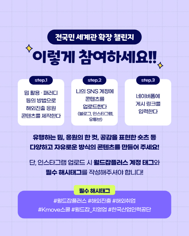 필수 해시태그 - #월드잡플러스 #해외진출 #해외취업 #KMove스쿨 #월드잡_치얼업 #한국산업인력공단 - @worldjob 공계 태그 및 언급하기 필수!