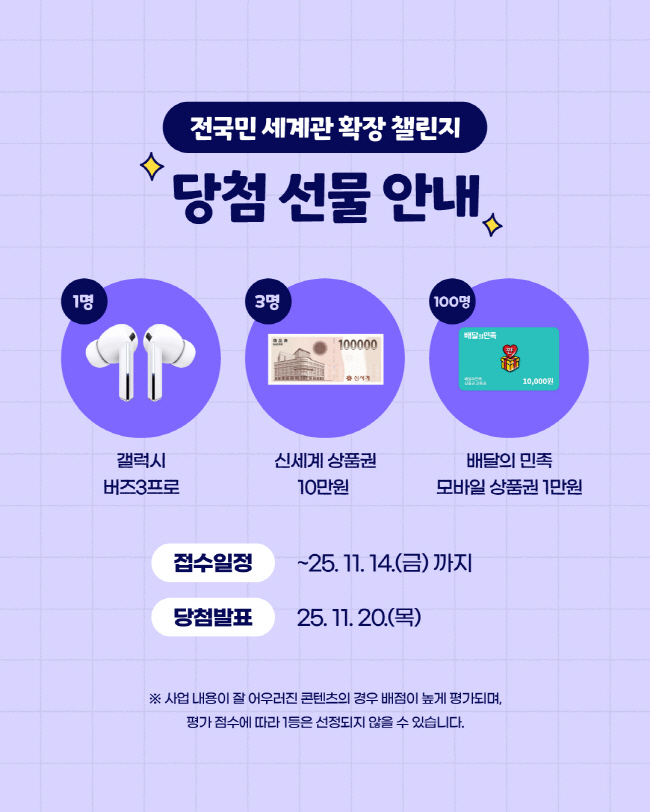 챌린지 경품 - 갤럭시 버즈3프로 (1명) - 신세계 상품권 10만원 (3명) - 배달의민족 모바일상품권 1만원 (100명)