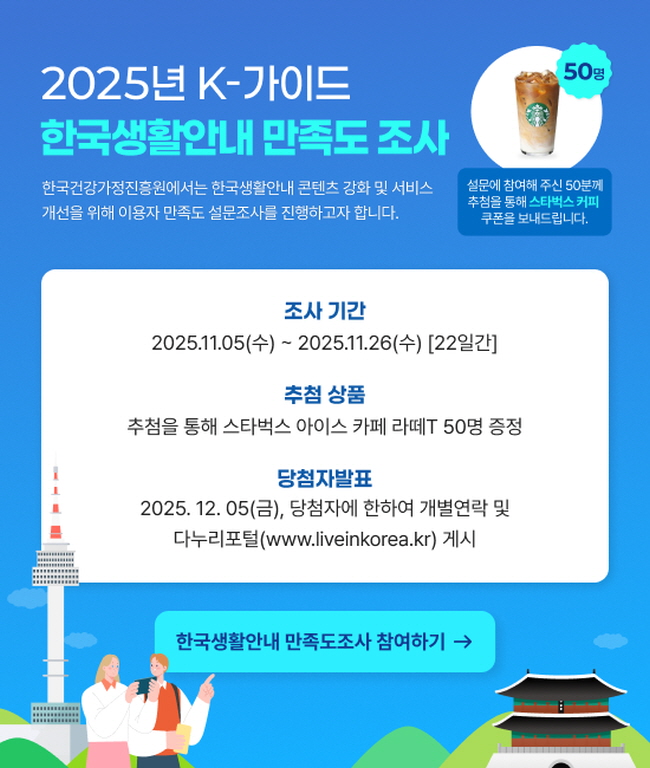 -한국건강가정진흥원에서는 한국생활안내 콘텐츠강화 및 서비스개선을 위해 이용자 만족도 조사를 진행하고자 합니다.