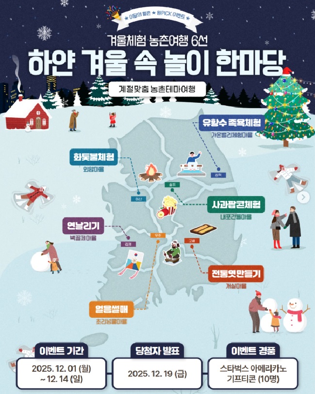 ![]() 하얀 겨울 속 다채로운 하루! 12월 겨울체험 농촌여행지 6선️ 웰촌이 추천하는 계절맞춤 농촌테마여행 따뜻함과 즐거움이 가득한 겨울 체험 마을들을 만나보세요! ️하얀 눈 위에서 짜릿한 겨울놀이 1️⃣ 김제 #벽골제마을 엄마아빠 어릴 때는 말이야~ 추억 가득 연날리기 체험 2️⃣ 무주 #초리넝쿨마을 더 시원하게 싱싱 달리는 얼음썰매 겨울 바람 속 따뜻함을 품은 하루 3️⃣ 삼척 #가온밸리체험마을 온 가족이 좋아하는 유황수 족욕체험 4️⃣ 아산 #외암마을 이색적인 화톳불 체험 달콤한 향기로 물드는 겨울의 맛 5️⃣ 고령 #개실마을 추운 겨울 달달~한 전통엿 만들기! 6️⃣ 충주 #내포긴들마을 흔하지 않은 사과팝콘 체험 지금, 가장 가보고 싶은 마을은 어디인가요? ️ [이달의 원픽 투표 이벤트] 참여하고 스타벅스 아메리카노 기프티콘 받자! (10명) 이벤트 기간: 12.01(월) ~ 12.14(일) 당첨자 발표: 12.19(금) 지금 웰촌 홈페이지에서 투표 참여 GO @welchon_official ‘프로필 링크’ 또는