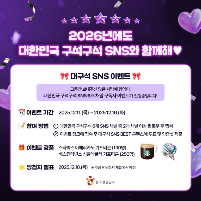 대한민국 구석구석 SNS 6개 채널 중 2개 이상 팔로우 후