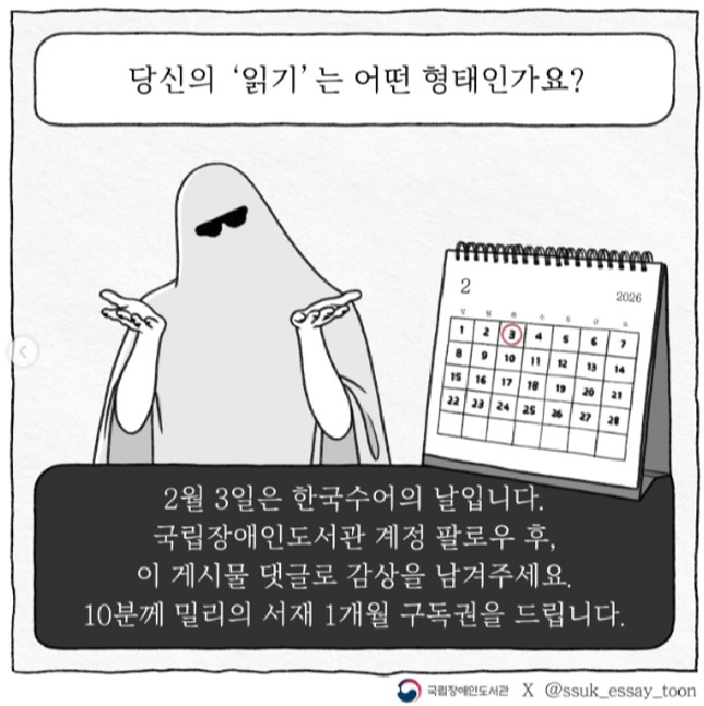 ![]() “당신의 ‘읽기’는 어떤 형태인가요?” 2월 3일은 ‘한국수어의 날’입니다. 한국에서 수어가 하나의 언어로 법정 인정을 받은 아주 뜻깊은 날이죠. 국립장애인도서관은 한국수어 사용자들을 위해 수어를 활용한 여러 대체자료를 제작하고 있습니다. 한국수어의 날을 맞아 이벤트를 준비했습니다. 여러분에게 ‘읽기’란 무엇인가요? 그리고, 어떤 형태와 방법으로 읽으시나요? 자유롭게 의견을 남겨 주세요. <예시> “저는 학교가는 길에 오디오북으로 책 듣는걸 좋아해요!“ “종이책 감촉을 좋아해서 도서관에서 책을 빌려 읽습니다.” “언제 어디서나 쉽게 볼 수 있도록 전자책을 선호해요~” 참여방법 (1) 내가 선호하는 ‘읽기 방법’을 댓글로 남기기 (2) 국립장애인도서관(@nld_korea) 계정 팔로우하기 이벤트 상품 밀리의서재 1개월 구독권 (10명) 이벤트 기간 2026년 2월 3일(화) ~ 2월 18일(수) 당첨자 발표 2026년 2월 27일(금) ※ 본 게시글 댓글 및 국립장애인도서관 공식 계정(@nld_korea)으로 발표 ※ 댓글 발표 시 당첨자 아이디가 공개됩니다. 본 이벤트 참여 시 해당 내용에 동의하는 것으로 간주됩니다.