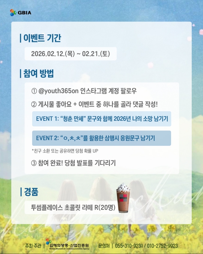 ▶ 기간: ~ 02.19.(목) ▶참여방법 1. @youth365on 인스타그램 계정 팔로우! 2. 본 게시물 좋아요 누르고 아래 미션 중 하나를 골라 댓글 작성 - MISSION 1: "청춘 만세" 문구와 함께 2026년 나의 소망 남기기 - MISSION 2: "ㅇ,ㅊ,ㅊ"를 활용한 센스 있는 삼행시 응원문구 남기기 *친구 소환이나 게시물 공유 시 당첨 확률 UP! ▶ 경품: 투썸플레이스 초콜릿 라떼 R (20명) |