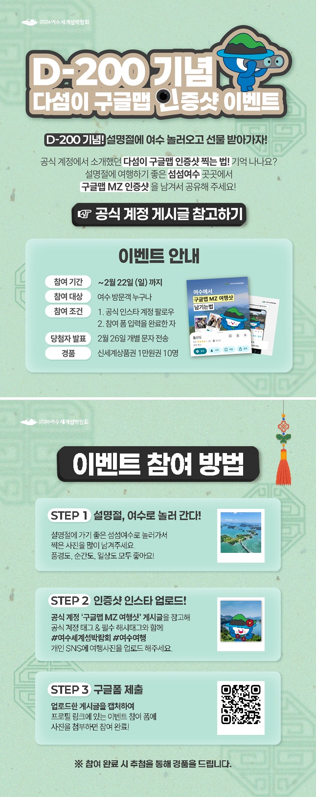 참여방법 : 1. 설 명절, 여수로 놀러가서 사진을 찍는다. 2. 구글맵 MZ여행샷 게시글을 참고하여, 박람회 공식 계정 태그 필수 해시태그와 함께 인스타그램에 업로드한다. 3. 게시글 링크를 구글폼에 제출한다.
