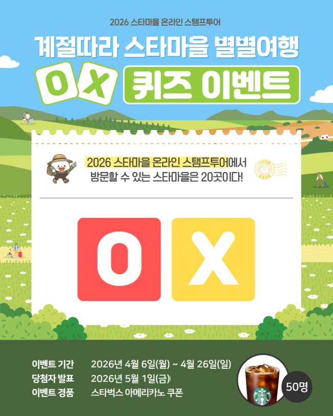 전국 스타마을을 대상으로 계절따라 스타마을 별별여행 온라인 스탬프투어가 진행 중인데요! 얼마나 잘 알고 있는지 OX 퀴즈로 맞혀볼까요~?