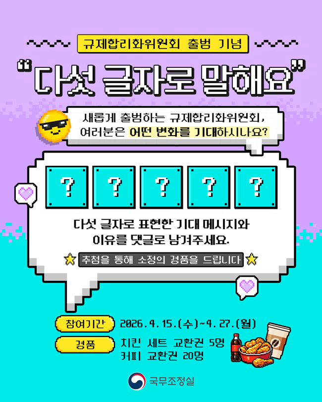 규제합리화위원회에 대한 기대감, 다섯 글자로 말해요! 대통령 소속 ‘규제합리화위원회‘ 출범을 기념하여 여러분이 갖고 있는 기대감을 다섯 글자로 표현해주세요! ex. 더빠른행정 / 합리적행정 추첨을 통해 소정의 경품을 드립니다! ️참여 방법 ① 국무조정실 규제합리화 블로그 이웃 추가 ② 이벤트 게시글 좋아요와 다섯 글자로 기대감 댓글로 작성 ③ 이벤트 게시글 내 네이버 폼 작성 참여링크: https://naver.me/xTy18lru ️이벤트 참여 기간 : 26.04.15(수)~26.04.27(월) ️당첨자 발표: 5월 중 이벤트 경품 : 치킨 세트 교환권(5명) / 커피 교환권 (20명) 유의사항 *이벤트 내용 및 경품 지급은 내부 사정에 따라 사전 고지 없이 변경될 수 있습니다. *개인정보 오기입과 문자수신 동의를 하지 않아 발생하는 경품 오발송 시 재발송 되지 않습니다. *이벤트 성격에 맞지 않는 내용이나 근거 없는 비방 글 등 문제의 소지가 있는 내용은 임의로 삭제될 수 있고, 이벤트 응모에서 제외됩니다. |