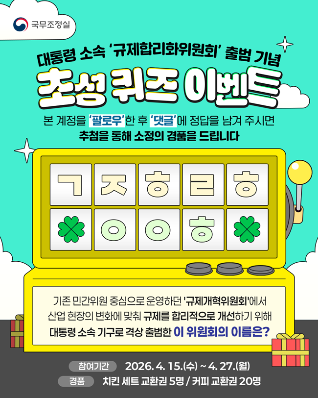 ️참여 방법 ①인스타그램 국무조정실 규제합리화 공식 계정 팔로우 ②해당 이벤트 게시글 좋아요와 댓글로 정답 작성 ③프로필 상단 네이버 폼 작성 @koreareg https://form.naver.com/response/k3MV1B-ozjXl4NRTy9qFPg
