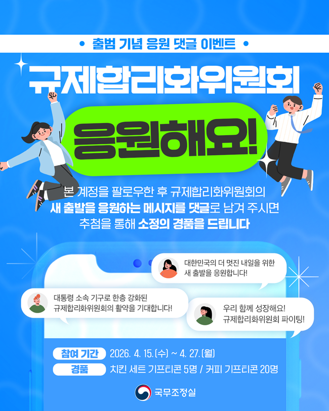 여러분의 응원 한마디가 더 나은 정책과 변화의 시작이 됩니다! 규제합리화위원회의 새 출발을 응원하는 메시지를 댓글로 남겨주시면 추첨을 통해 경품을 드립니다.