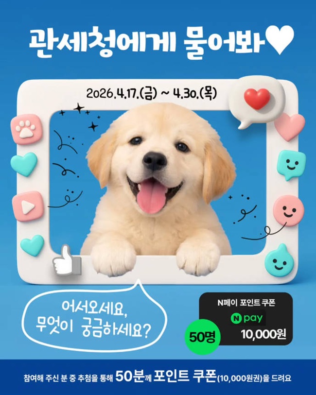 ️이벤트 기간 : 2026. 4. 17.(금) ~ 4. 30.(목) ️당첨자 발표 : 2026. 5. 7.(목) *관세청 공식 인스타그램 링크에서 확인 ️이벤트 경품 : 네이버페이 포인트 1만 원 (50명)