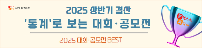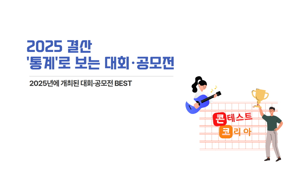 2026년, 붉은 말의 해가 밝았습니다! 지난 한 해 동안 콘테스트코리아와 함께해 주신 모든 회원 여러분께 진심으로 감사드립니다. 2026년에도 콘테스트코리아는 더 많은 기회, 더 정확한 정보, 더 빠른 소식으로 여러분의 도전을 가까이에서 응원하겠습니다. 이번 뉴스레터에서는 2025년 한 해 동안 콘테스트코리아에 접수된 대회·공모전 데이터를 바탕으로, 회원 여러분의 실제 관심이 어디에 모였는지를 정리해봤습니다. 특히 매년 꾸준히 개최되며 상위권을 유지하고 있는 공모전들 위주로 소개해 드리오니, 다가오는 2026년 공모전 준비에 꼭 참고해 보세요. 여러분의 한 번의 클릭이 다음 도전의 시작이 되길 바라며, 올해도 콘테스트코리아가 늘 곁에서 응원하겠습니다.![]() 2025년 한 해 동안 가장 많은 공모전이 등록된 분야는 사진·영상·영화제(18.6%)로, 시각 콘텐츠 중심의 공모전이 강세를 보였습니다. 이어 미술·디자인·웹툰(16.9%), 아이디어·건축·창업(15.0%), 문학·문예(14.5%), 음악·콩쿠르·댄스(12.4%) 분야가 뒤를 이으며 창작·표현 중심 카테고리 전반에서 고른 관심이 나타났습니다. 반면 네이밍·슬로건, 스포츠, 요리·뷰티·오디션 분야는 비교적 소수지만, 특정 타깃을 중심으로 꾸준히 운영되는 특징을 보였습니다. ![]() 총 상금 1백만원~5백만원이 42.45%로 가장 높은 비율을, 1위 상금에서는 43.22%인 100만원~300만원 사이가 가장 높은 비율을 차지했습니다. ![]() 주최·주관별로는 정부·지자체·공공기관 37.39%, 참가자격별로는 일반인을 대상으로 한 공모전이 가장 높은 것을 확인하실 수 있습니다. ![]() 글 하단에서는 조회수 BEST 30 가운데 먼저 TOP 10 공모전을 소개해 드리고자 합니다. 특히 눈에 띄는 점은, 2024년에 이어 2025년에도 ‘상상인 신춘문예 공모’가 가장 높은 조회수를 기록하며 3년 연속 회원 여러분의 높은 관심을 받았다는 점입니다. 이는 문학·문예 분야 공모전에 대한 관심이 단발성이 아닌 지속적인 참여 흐름으로 이어지고 있음을 보여주는 결과라 할 수 있습니다. |