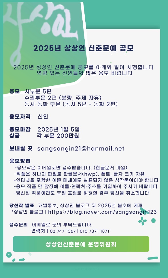 ![]() 글 하단에서 소개 드릴 조회수 BEST 30 중 먼저 전 BEST 10부터 소개드리고자합니다. 작년 한강 작가님의 노벨문학상 수상의 영향이였을까요? '질문과 답변' 게시글에서도 확인할 수 있었던 '2025년 상상인 신춘문예 공모'가 가장 뜨거운 관심을 받았습니다.