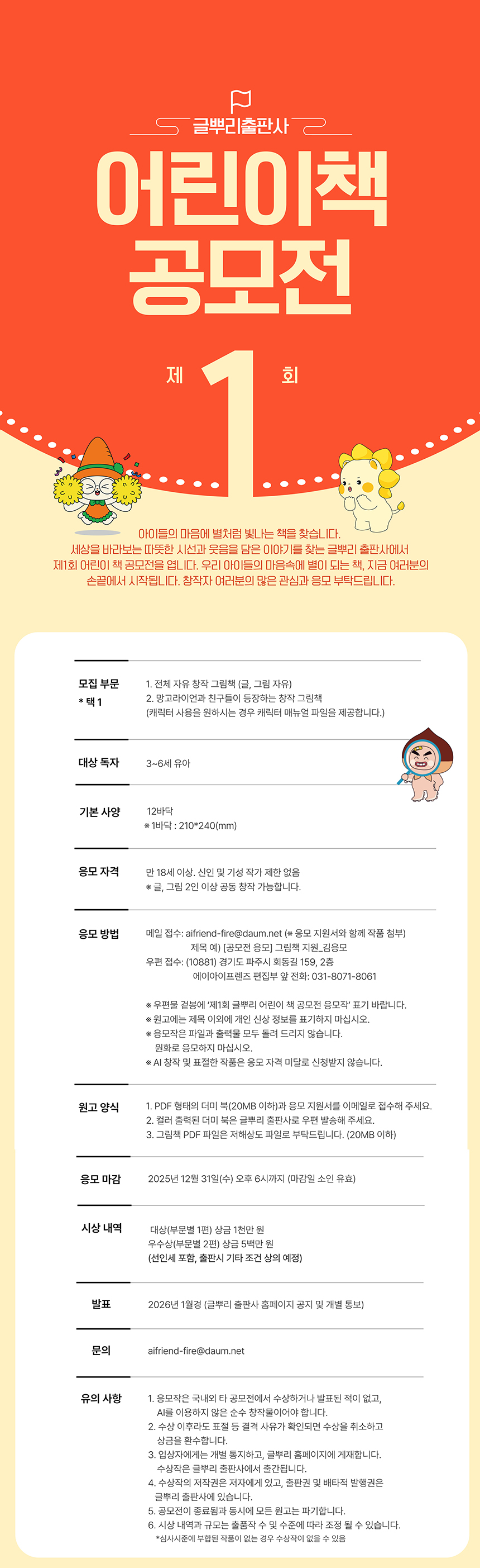 아이들의 마음에 별처럼 빛나는 책을 찾습니다. 세상을 바라보는 따뜻한 시선과 웃음을 담은 이야기를 찾는 글뿌리 출판사에서 제1회 어린이 책 공모전을 엽니다. 우리 아이들의 마음속에 별이 되는 책, 지금 여러분의 손끝에서 시작됩니다. 창작자 여러분의 많은 관심과 응모 부탁드립니다.