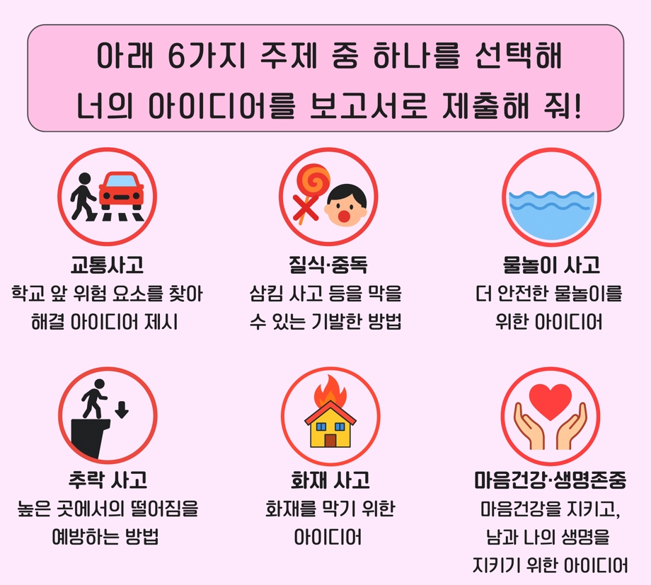 아동이 일상생활 속에서 직접 경험했거나 당할 뻔했던 안전사고 또는 '앗차 사고' 사례를 소개하고, 그 원인을 분석한 뒤, 유사 사고를 예방하기 위한 아이디어를 제안함으로써, 아동 친화적이고 친환경적인 교통문화를 조성하기 위한 사회적 인식 확산을 유도하고자 합니다. 또한 아동의 자발적인 참여를 통해 민주시민으로서의 역량을 강화하고, 아동 주도형 안전문화 정착의 기반을 마련하고자 합니다.