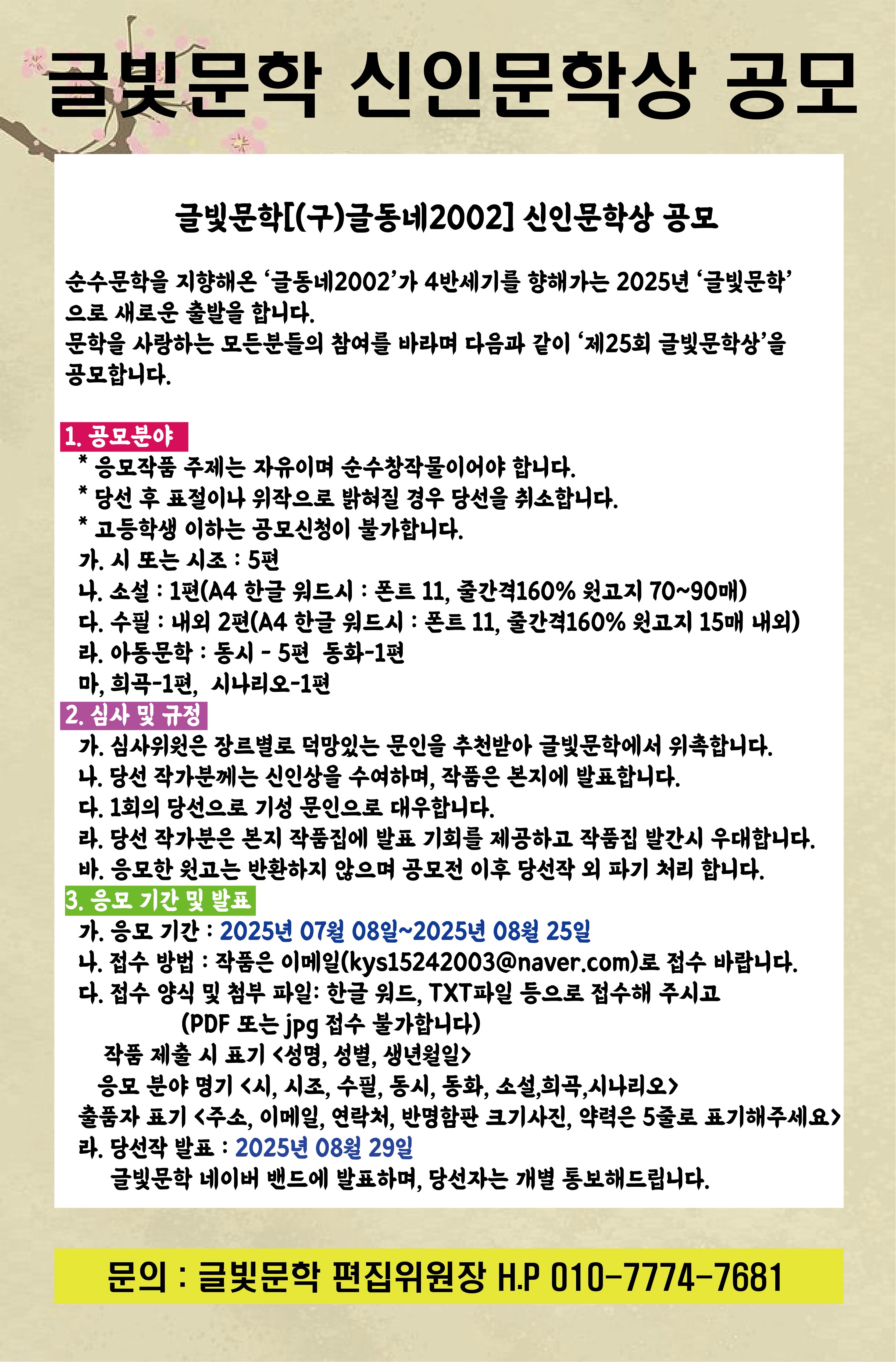 - 응모 분야 명기 <시, 시조, 수필, 동시, 동화, 소설, 희곡, 시나리오,평론>