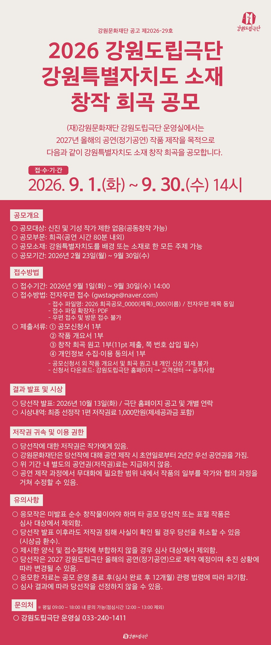 - 접수 파일명: 2026 희곡공모_0000(제목)_000(이름) / 전자우편 제목 동일