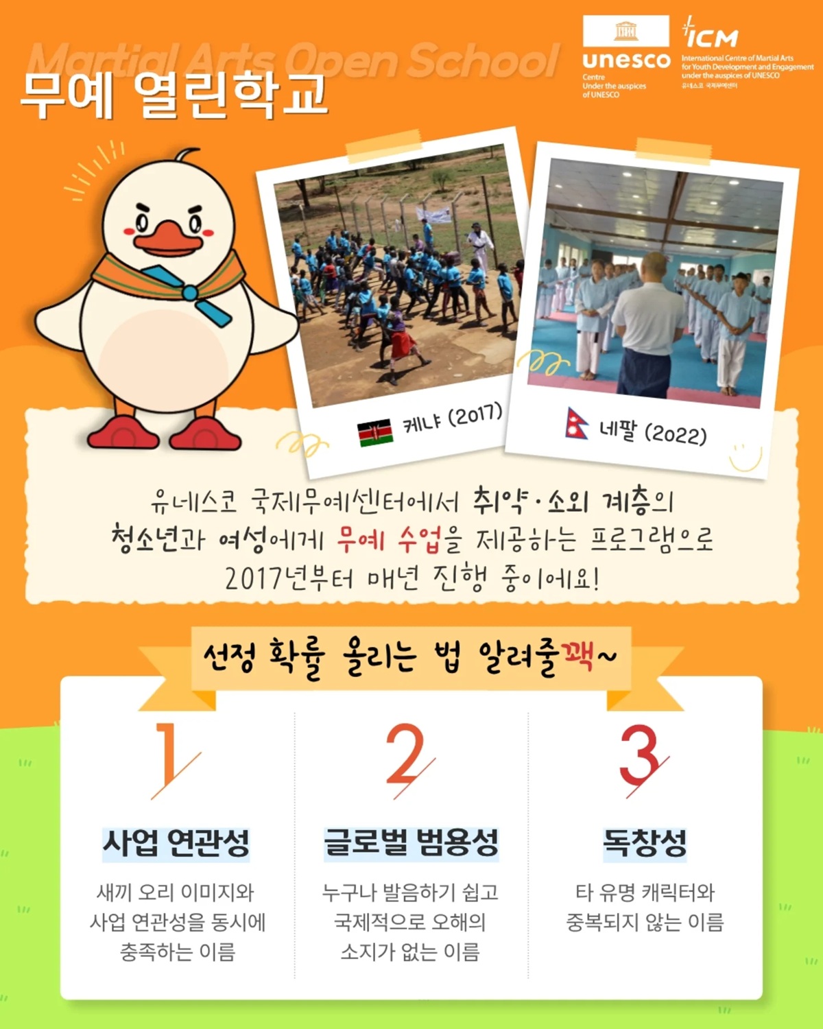 아래 4개 조건을 모두 만족하는 <무예 열린학교> 마스코트의 새로운 이름을 지어주세요!