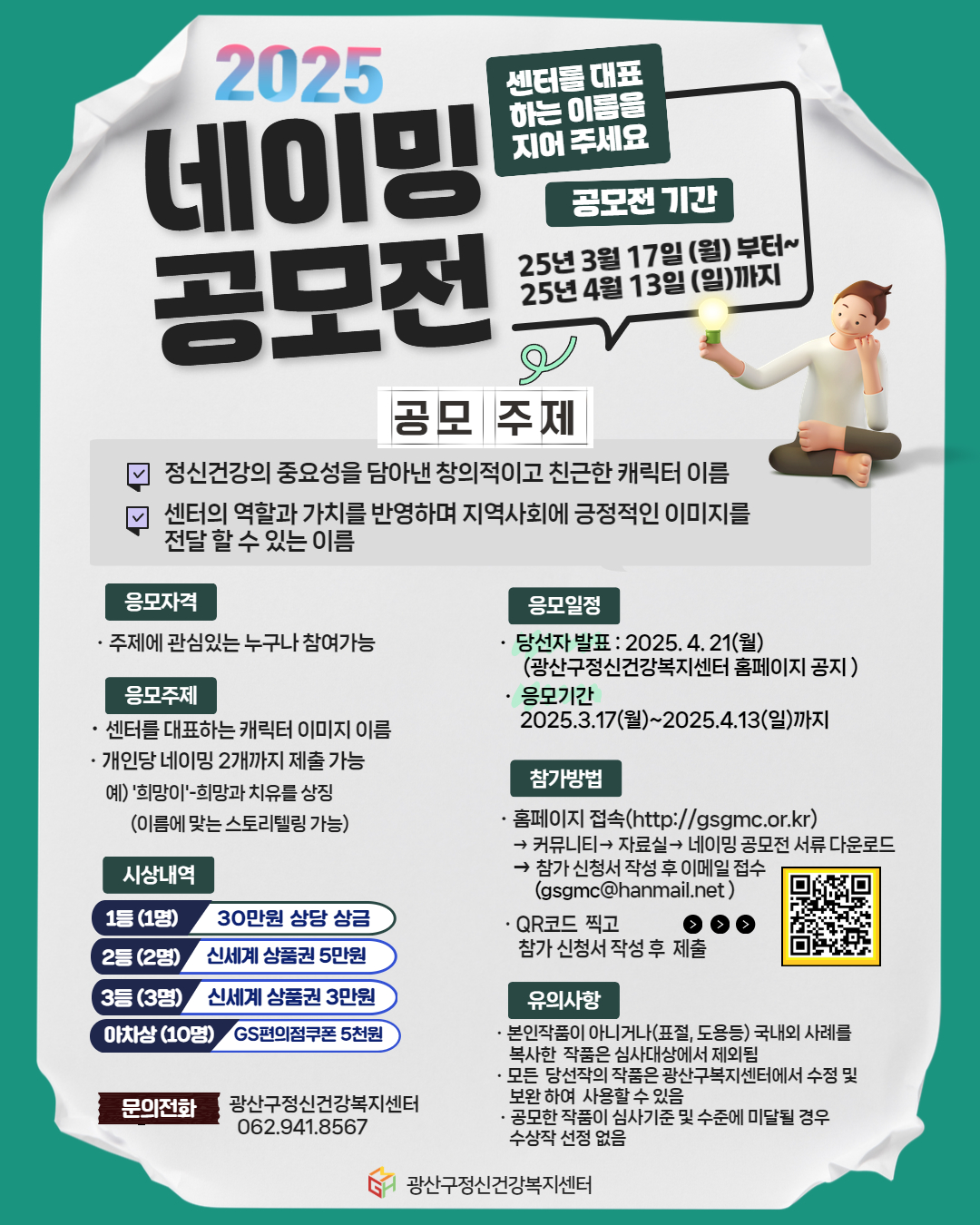 - 당선자 발표 : 2025. 4. 21(월)- 광산구정신건강복지센터 홈페이지 공지