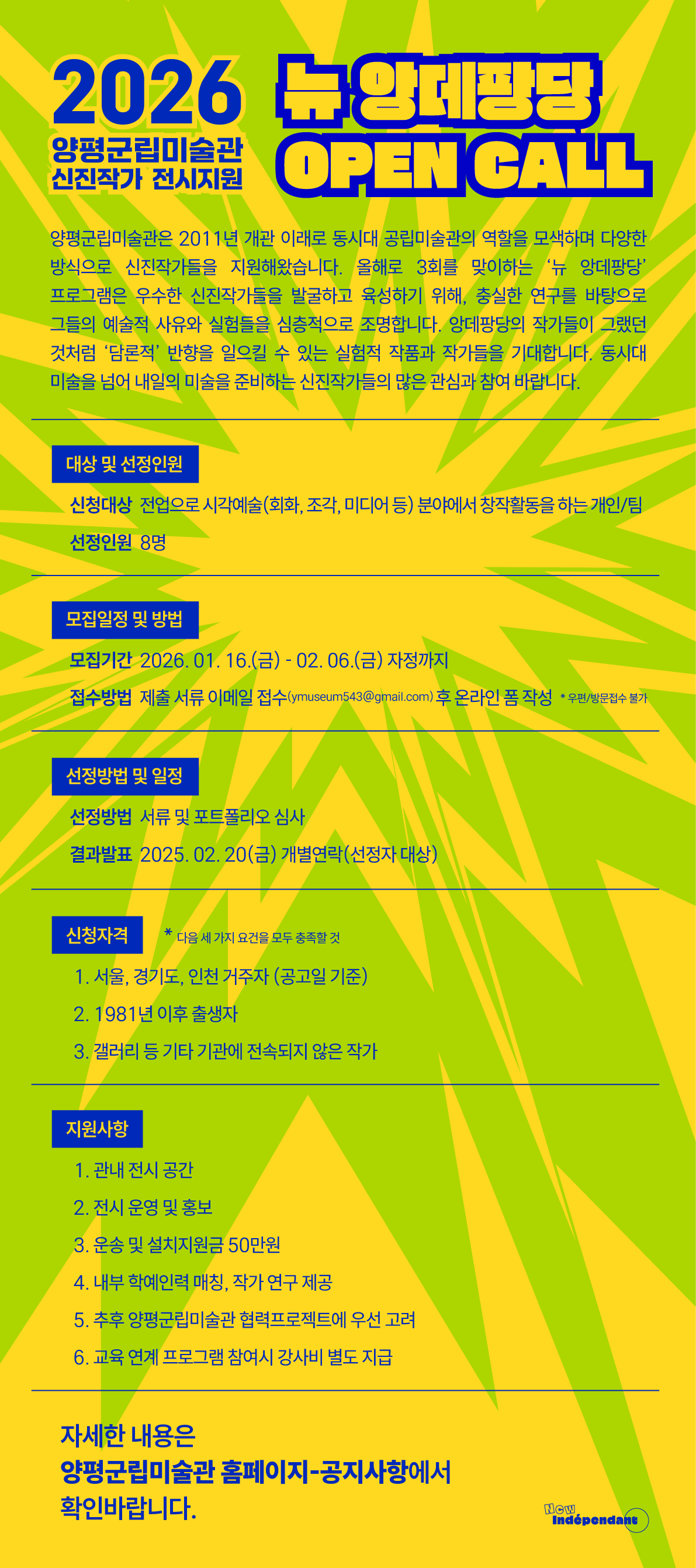 양평군립미술관은 2011년 개관 이래로 동시대 공립미술관의 역할을 모색하며 다양한 방식으로 신진작가들을 지원해왔습니다. 올해로 3회를 맞이하는 ‘뉴 앙데팡당’ 프로그램은 우수한 신진작가들을 발굴하고 육성하기 위해, 충실한 연구를 바탕으로 그들의 예술적 사유와 실험들을 심층적으로 조명합니다. 앙데팡당의 작가들이 그랬던 것처럼 ‘담론적’ 반향을 일으킬 수 있는 실험적 작품과 작가들을 기대합니다. 동시대 미술을 넘어 내일의 미술을 준비하는 신진작가들의 많은 관심과 참여 바랍니다.