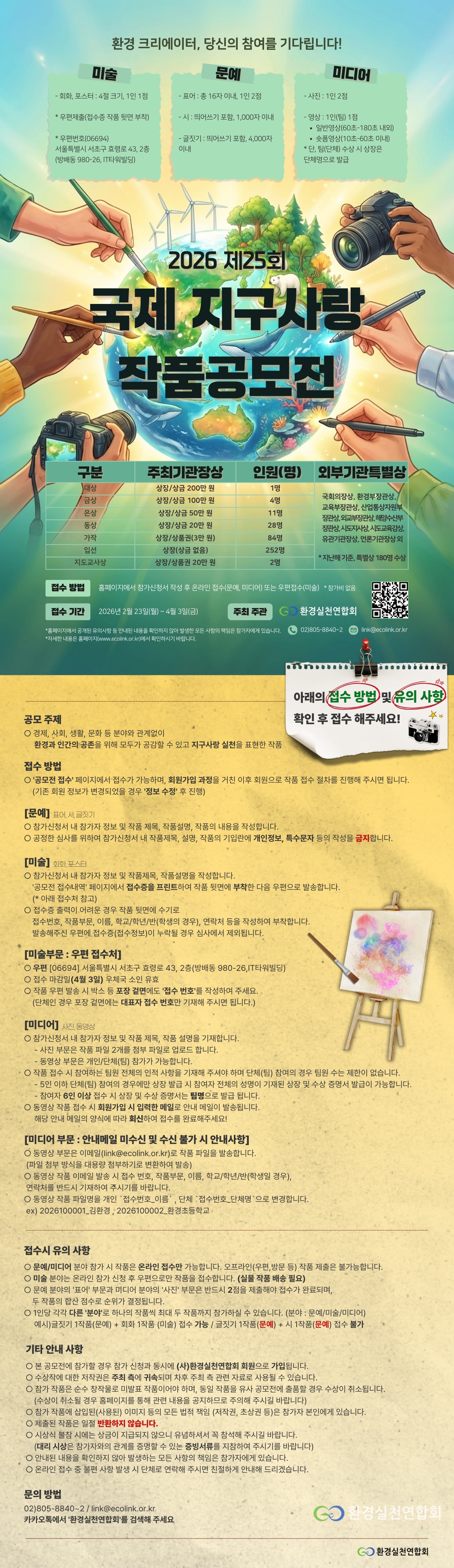 - 미디어 분야(영상) : 온라인 접수 후 접수번호, 작품명 기재하여 작품 첨부 후 이메일 전송(link@ecolink.or.kr)