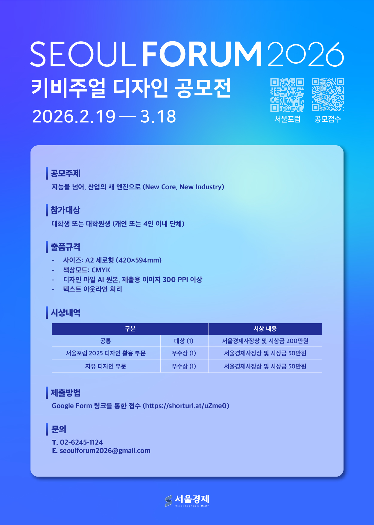 서울경제 주관으로 개최하는 서울포럼 2026 키비주얼 디자인 공모전은 AI가 산업과 사회의 중심 동력으로 이동하는 전환의 흐름을 배경으로 「지능을 넘어, 산업의 새 엔진으로(New Core, New Industry)」라는 서울포럼 2026의 주제(가제)를 명확하고 인상적인 시각 언어로 구현할 키비주얼을 모집합니다.