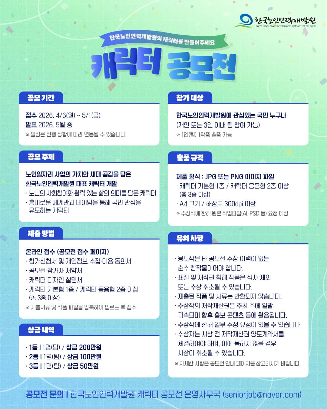 한국노인인력개발원 캐릭터 공모전 운영사무국 (email : seniorjob@naver.com)