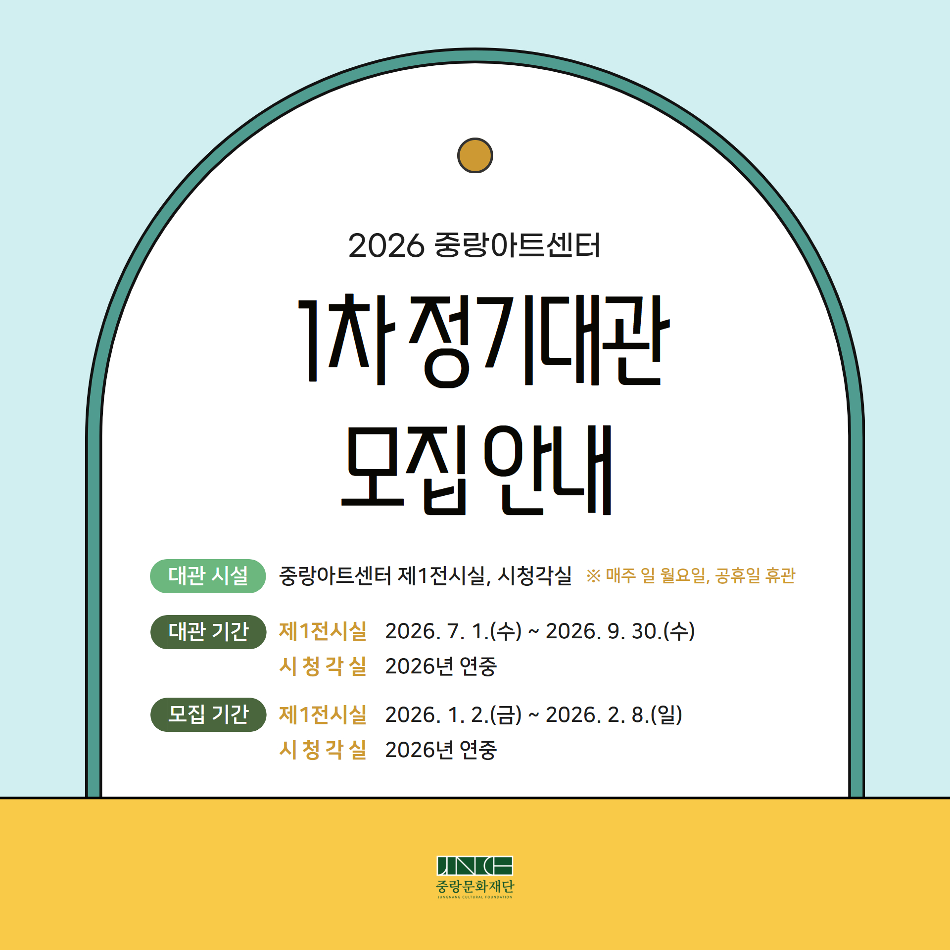 - 제1전시실: 내부심사 2026년 2월 10일(화) ~ 2월 13일(금) / 결과발표 홈페이지 공지 및 개별 통보