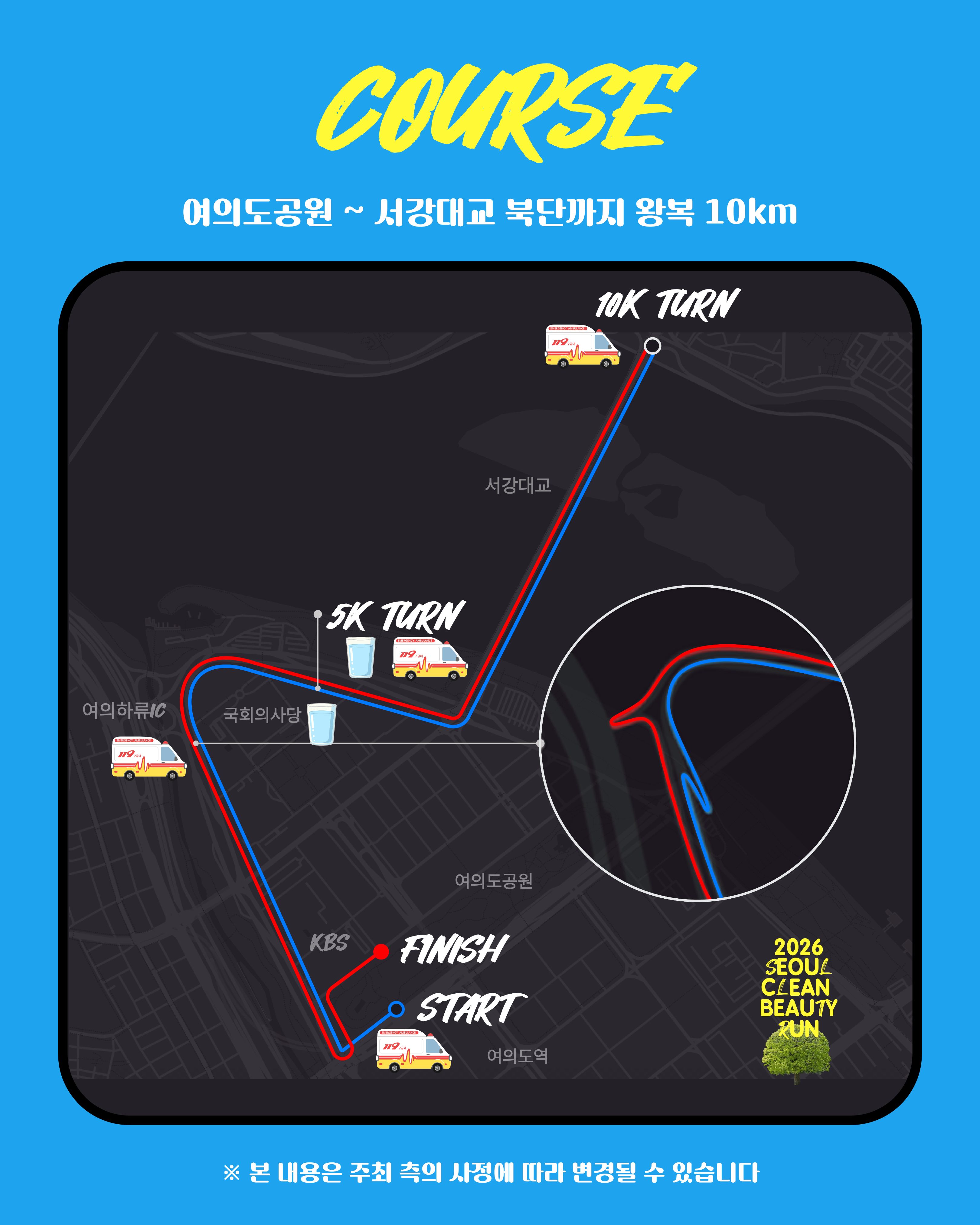 10km 여의도 공원 (출발) → 서강대교 (반환) → 여의도 공원 (도착)