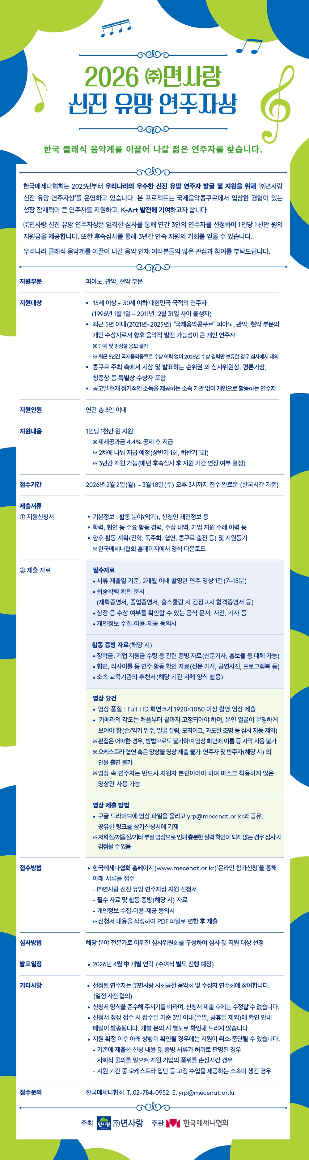 - 선정된 연주자는 ㈜면사랑 사회공헌 활동 및 수상자 연주회에 참여합니다.(일정 사전 협의)