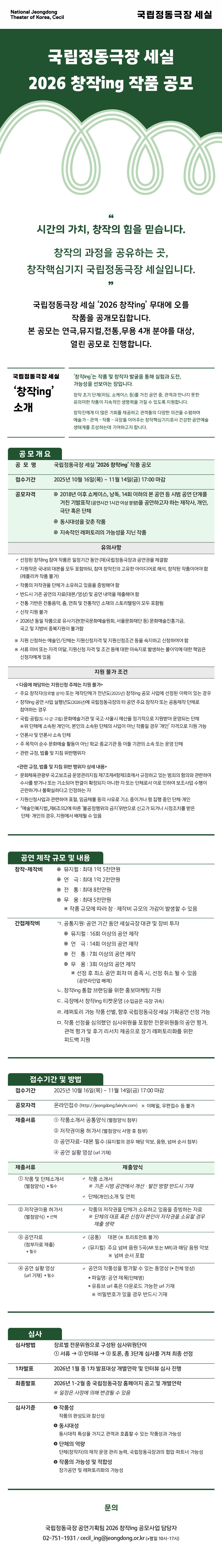 ○ 최종발표 : 2026년 1-2월 중 국립정동극장 홈페이지 공고 및 개별연락