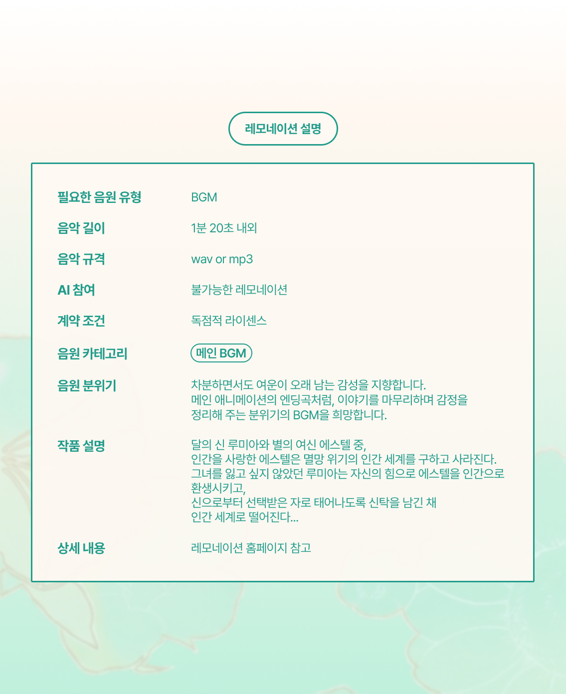 메인 애니메이션의 엔딩곡처럼, 이야기를 마무리하며 감정을 정리해 주는 분위기의 BGM을 희망합니다.