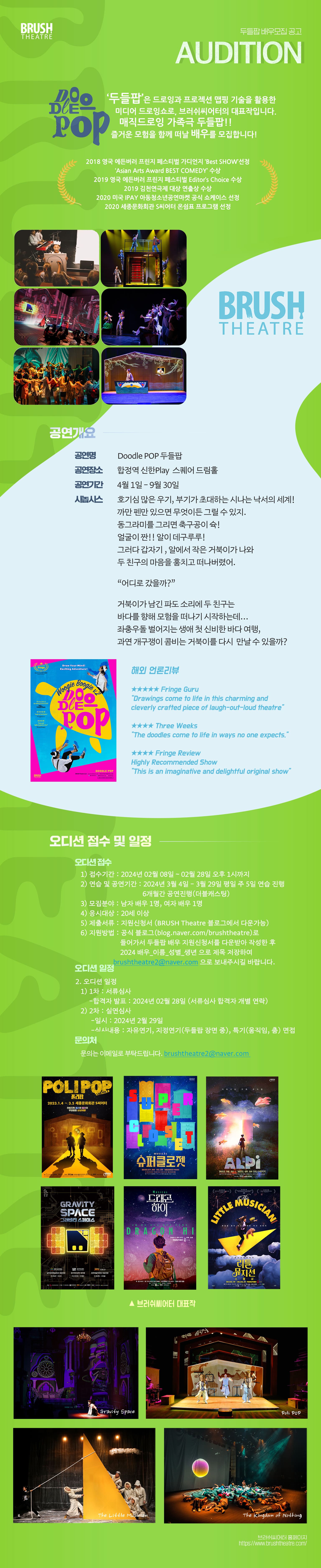 공식 블로그(blog.naver.com/brushtheatre)로 들어가서 두들팝 배우 지원신청서를 다운받아 작성한 후2024 배우_이름_성별_생년 으로 제목 저장하여 brushtheatre2@naver.com 으로 보내주시길 바랍니다.