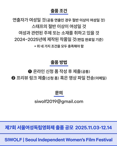 - 제7회 서울여성독립영화제 출품 공모 신청 폼: https://forms.gle/XpUPZCT38QYdeJrW8