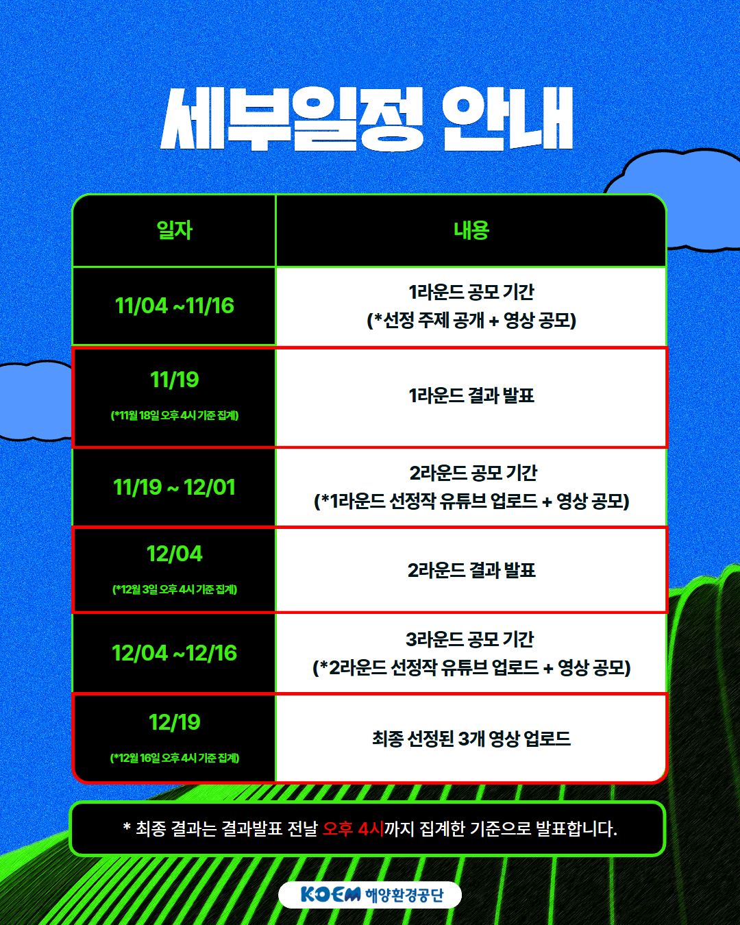 각 라운드에서 선정된 영상은 다음 참가자가 이어갈 스토리의 출발점이 되며, 마지막에는 모든 영상을 연결한 최종 본편이 해양환경공단 공식 채널에 업로드됩니다.