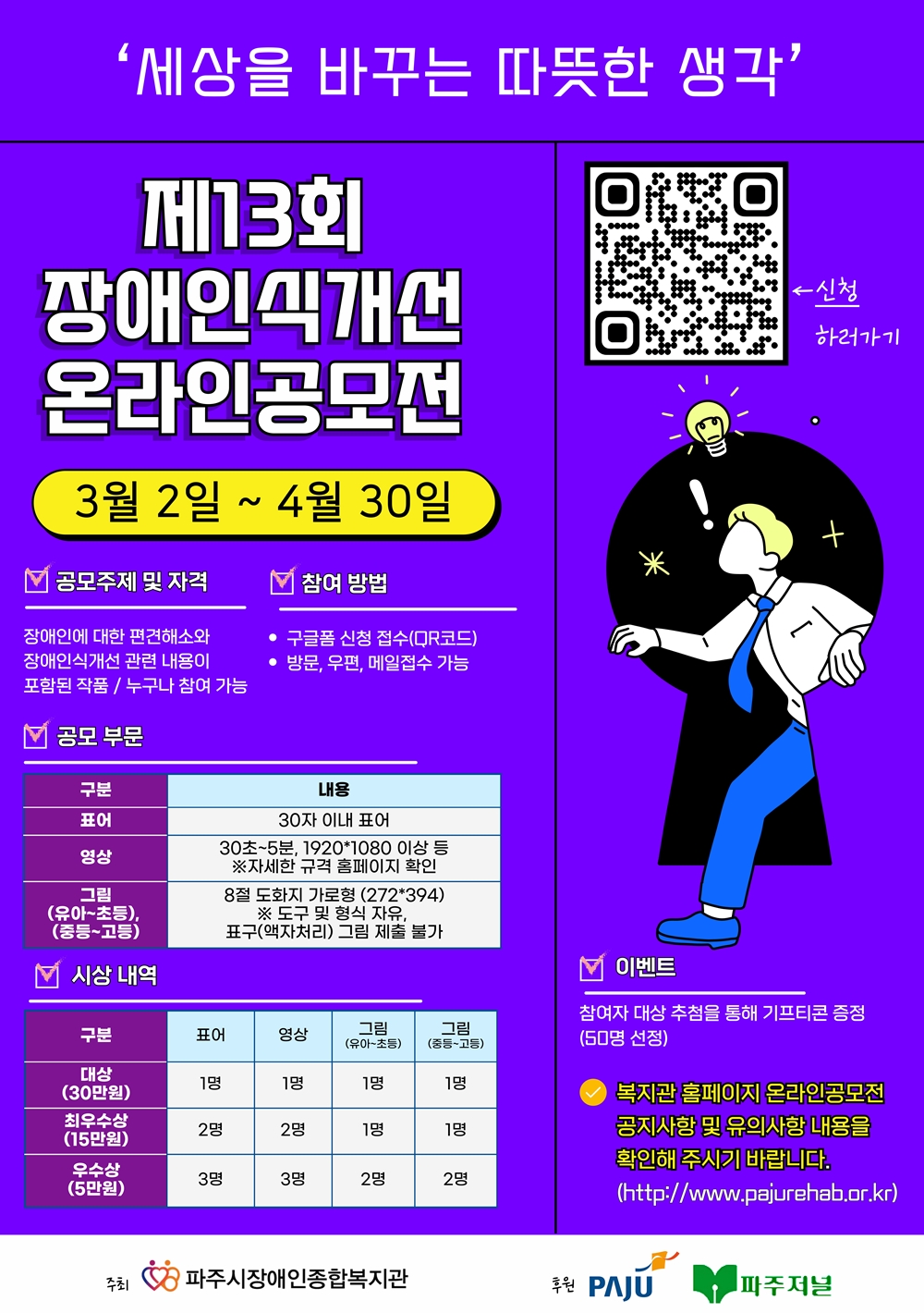 ![[접수하기 링크 오류] 제13회 장애인식개선 온라인공모전 '세상을 바꾸는 따뜻한 생각'](/admincenter/files/meet/202602241558553749175.jpg)