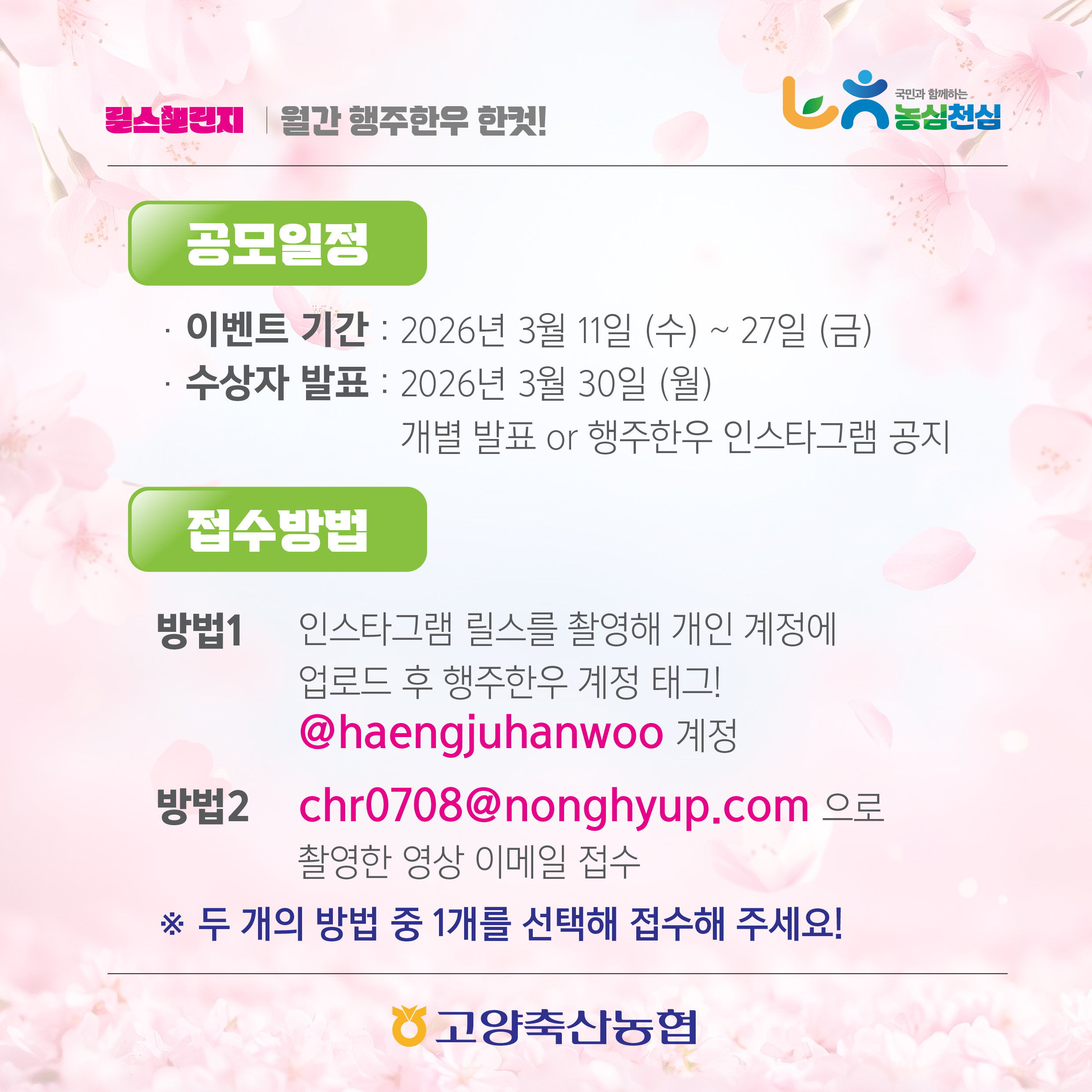 - 응모된 사진·영상은 고양축산농협 SNS 콘텐츠로 재가공 및 활용될 수 있습니다