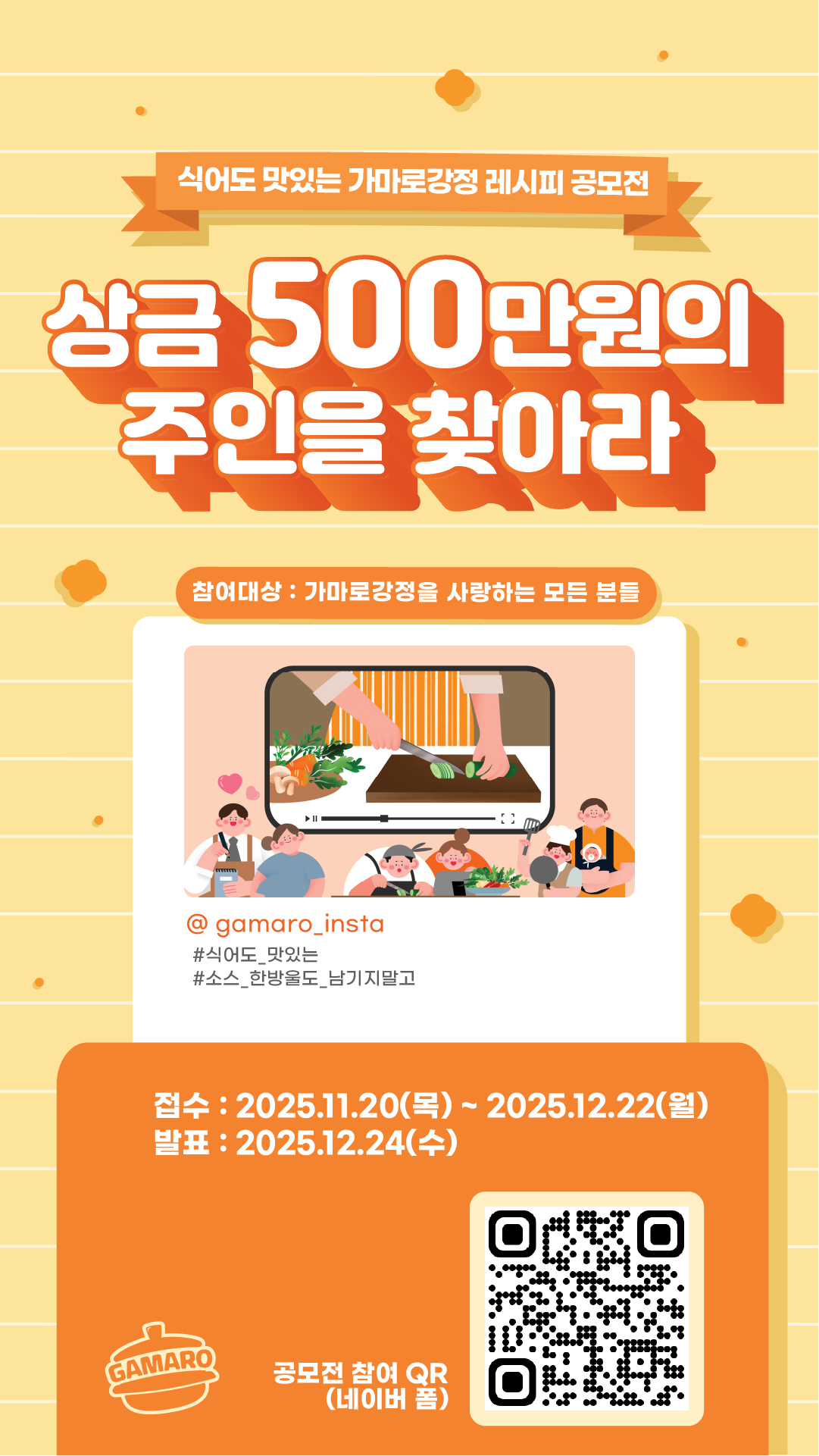 | 시상내역 | 상금+상품(총상금 : 500만원 / 1위 : 200만원 / 가마로강정 트리플 모바일쿠폰 / 가마로강정 2,000원 상품권) |