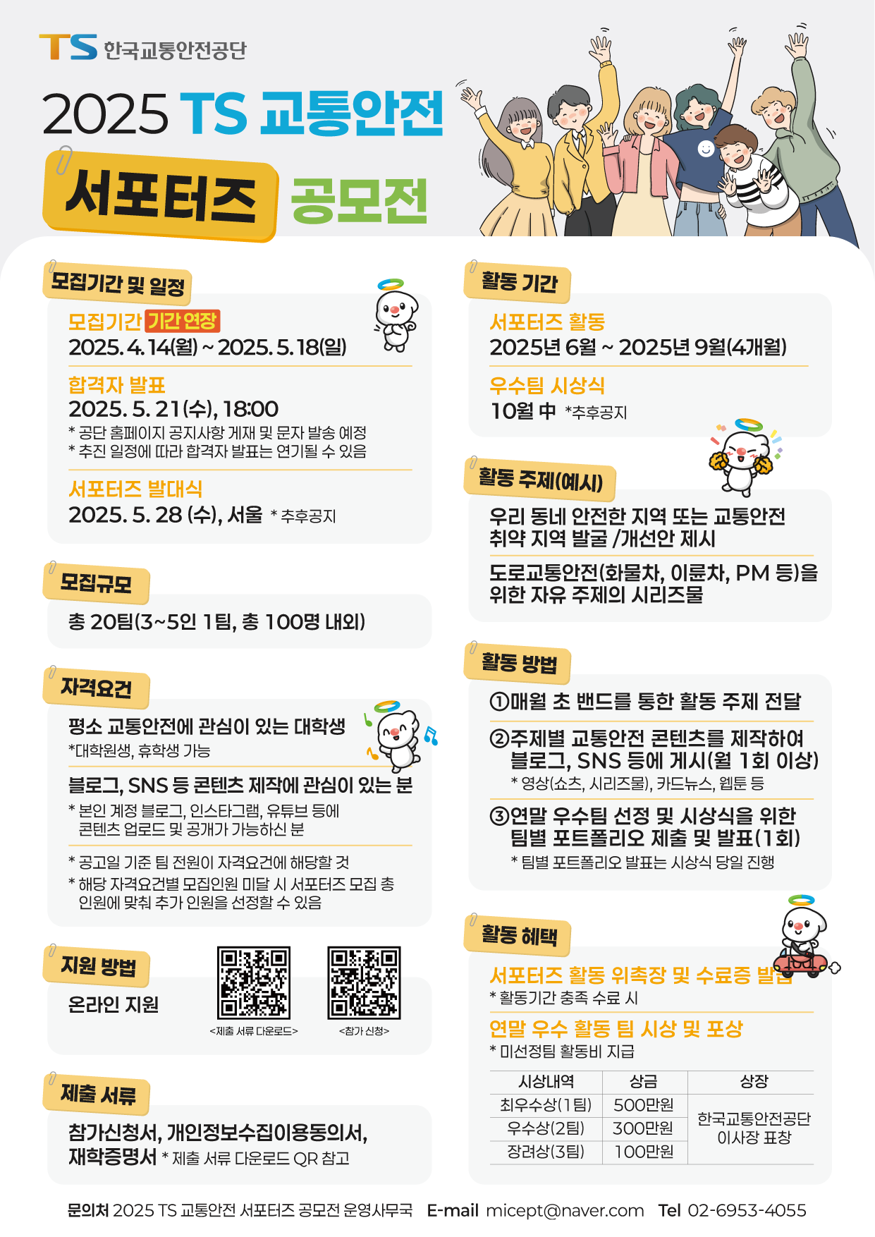 2025 TS 교통안전 서포터즈 공모전 사무국 (이메일 : micept@naver.com / 전화번호 : 02-6953-4055)
