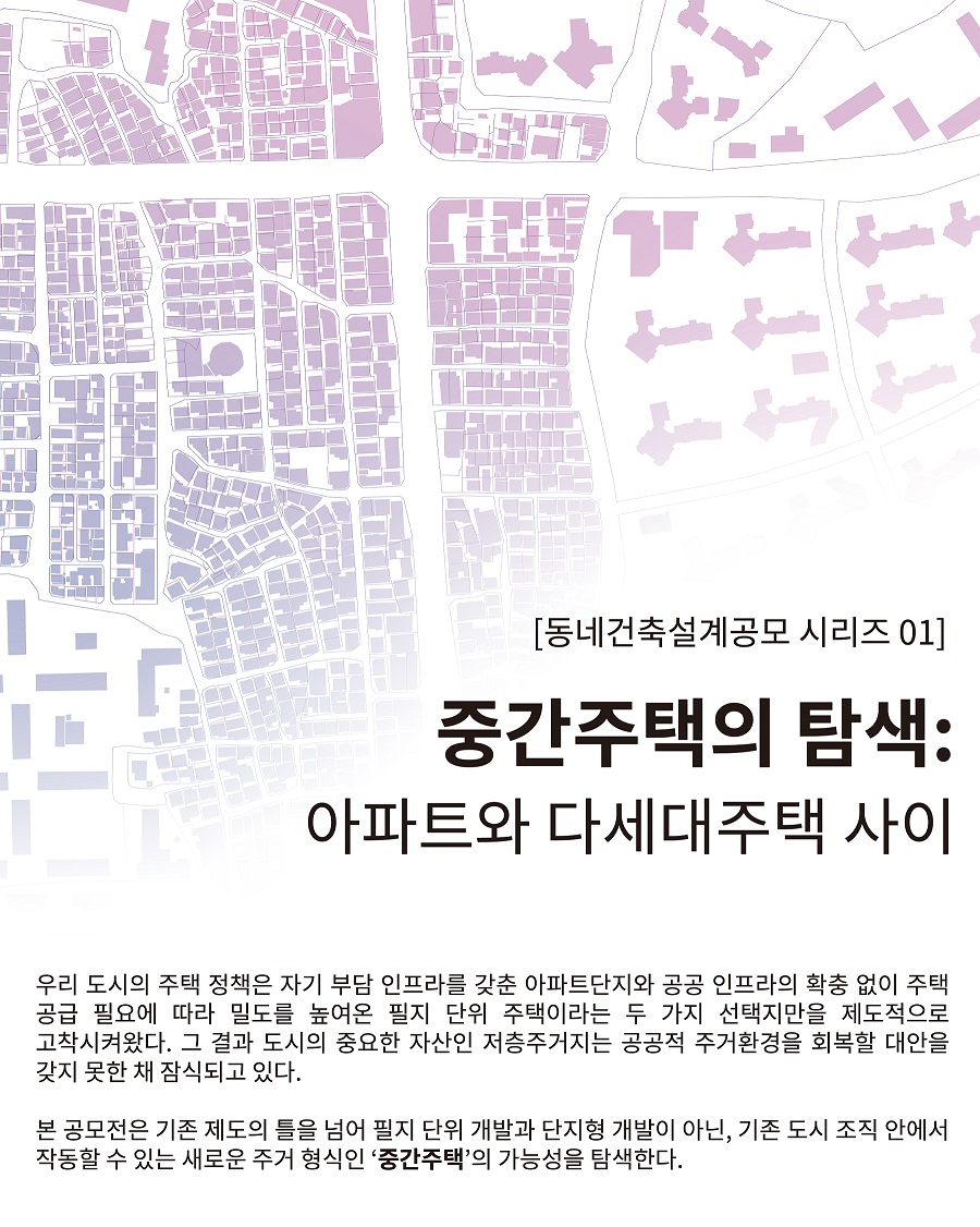 + 저층주거지에 적용되고 있는 현행 법령과 제도에 얽매이지 않고, 대지와 건축물 규모, 세대와 가구, 공간구성, 가로와의 관계 등을 포괄하는 새로운 중간주택 유형과 이를 가능하게 하기 위해 필요한 법제도의 변경 방안이 제시되기를 기대합니다. 아울러 분양과 임대로 양극화된 기존 개발 방식과 주체, 운영구조 전환에 대한 제안 역시 기대합니다.