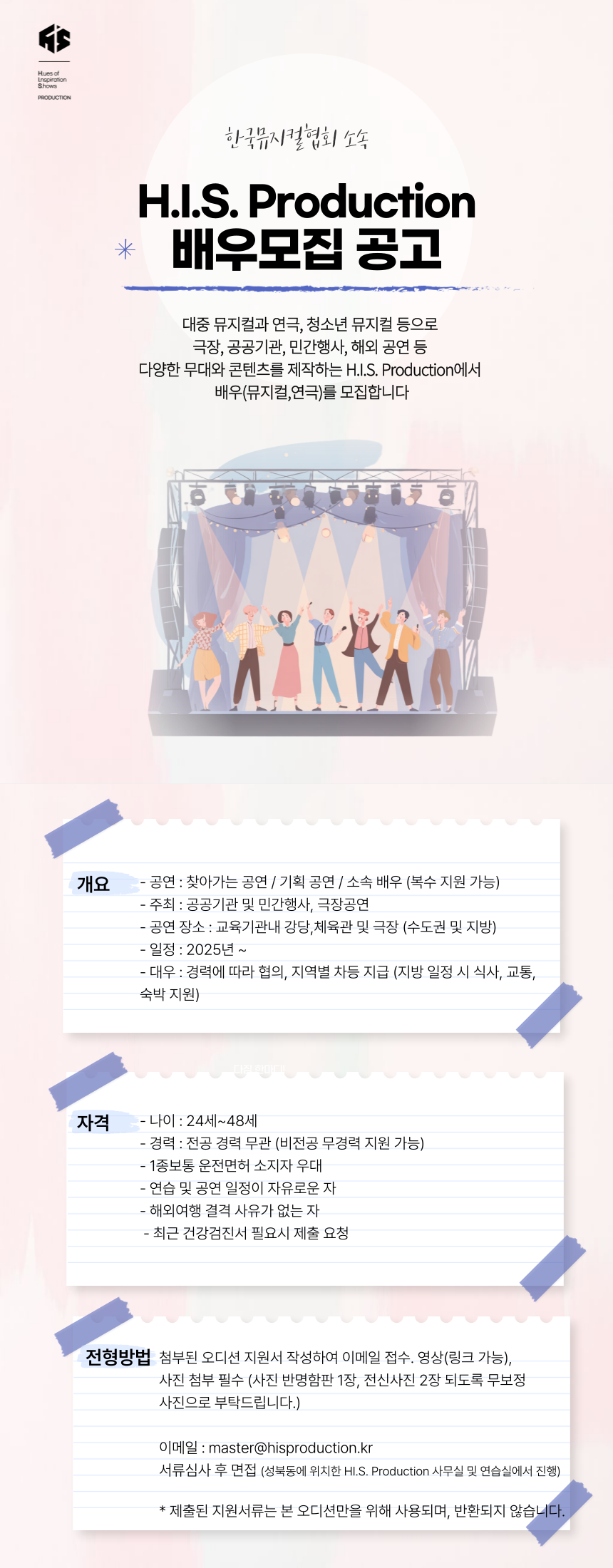 첨부된 오디션 지원서 작성하여 이메일 접수. 영상(링크 가능), 사진 첨부 필수 (사진 반명함판 1장, 전신사진 2장 되도록 무보정 사진으로 부탁드립니다.)