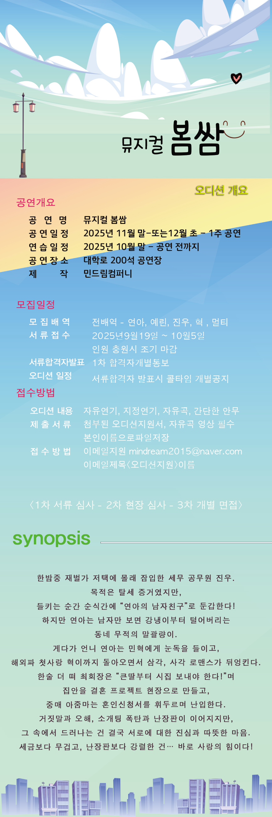 이메일지원 mindream2015@naver.com 이메일제목〈오디션지원〉이름