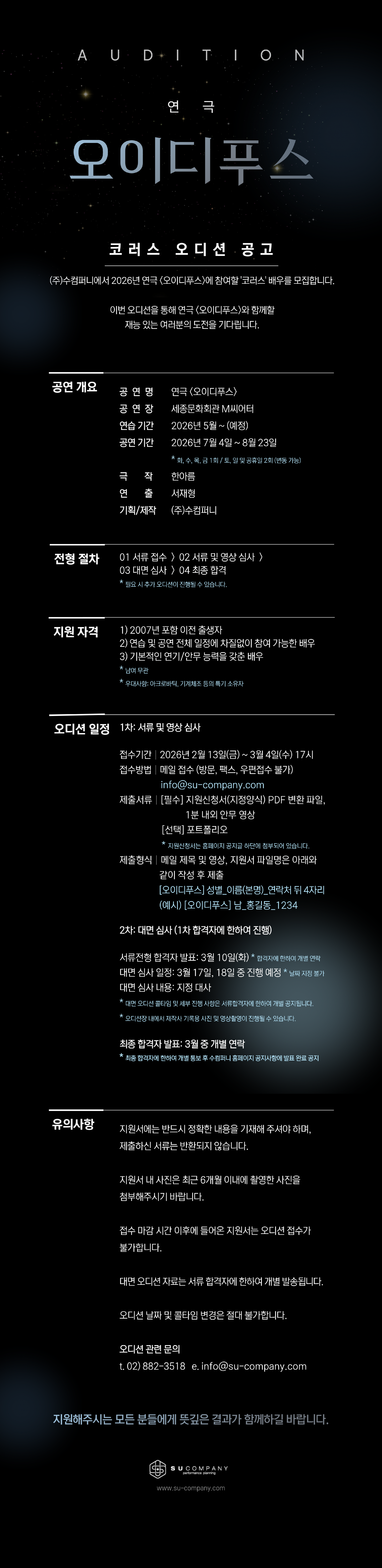 * 대면 오디션 콜타임 및 세부 진행 사항은 서류합격자에 한하여 개별 공지됩니다.